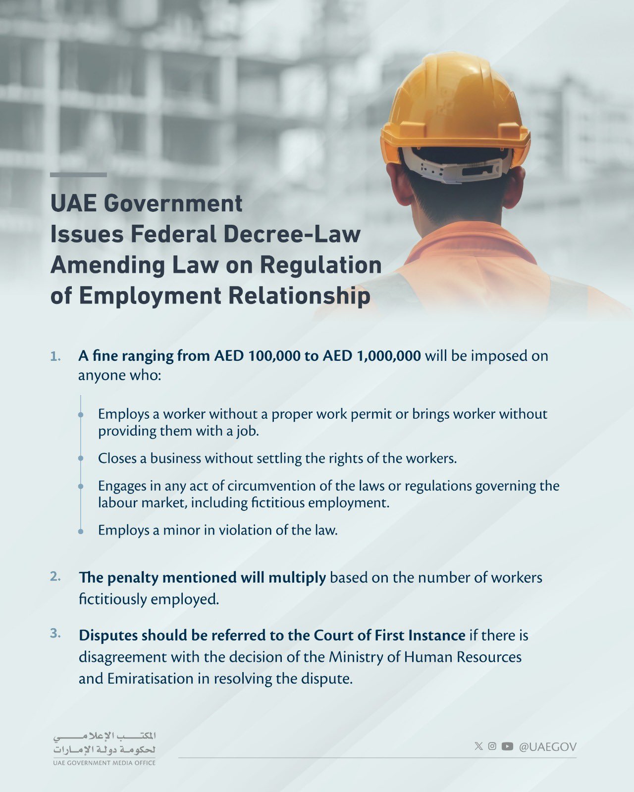 The decree imposes fines of no less than AED100,000 and no more than AED1 million on any employer who employs workers without a proper permit, hires workers or brings them to the country and fails to provide them with a job, misuses work permits, or shuts down a business or suspends its activities without settling workers' rights, in violation of the new decree and its Executive Regulations. The same penalties apply to the illegal employment of minors or allowing minors to work in violation of the law by their guardians.
