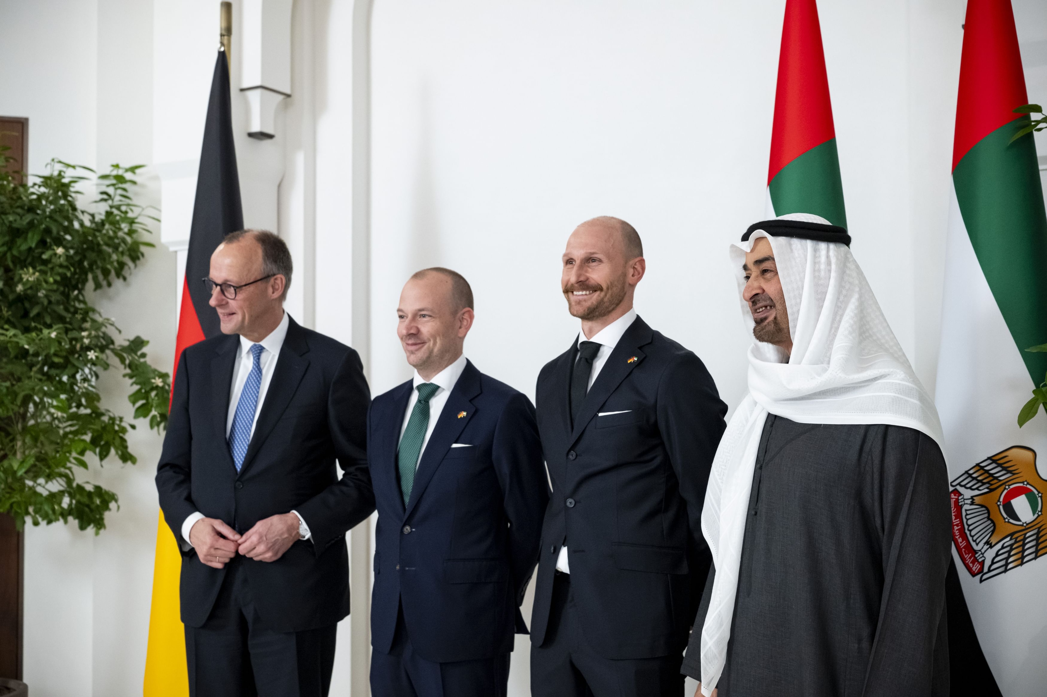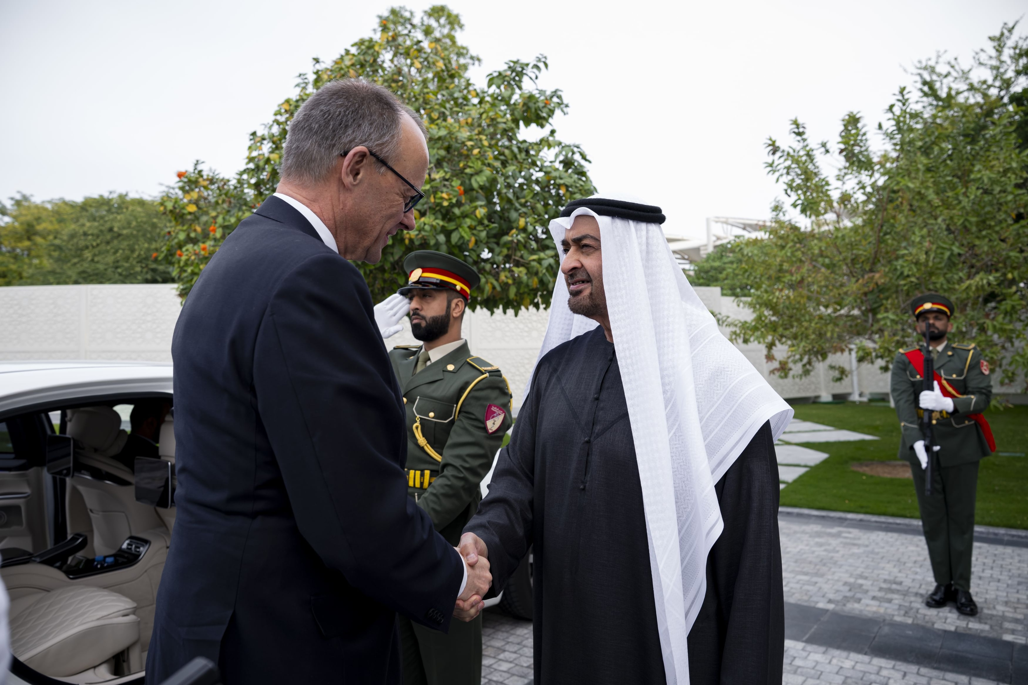 UAE President His Highness Sheikh Mohamed bin Zayed Al Nahyan met with His Excellency Friedrich Merz, Chancellor of the Federal Republic of Germany, to explore ways to deepen bilateral cooperation in support of shared interests and development priorities.