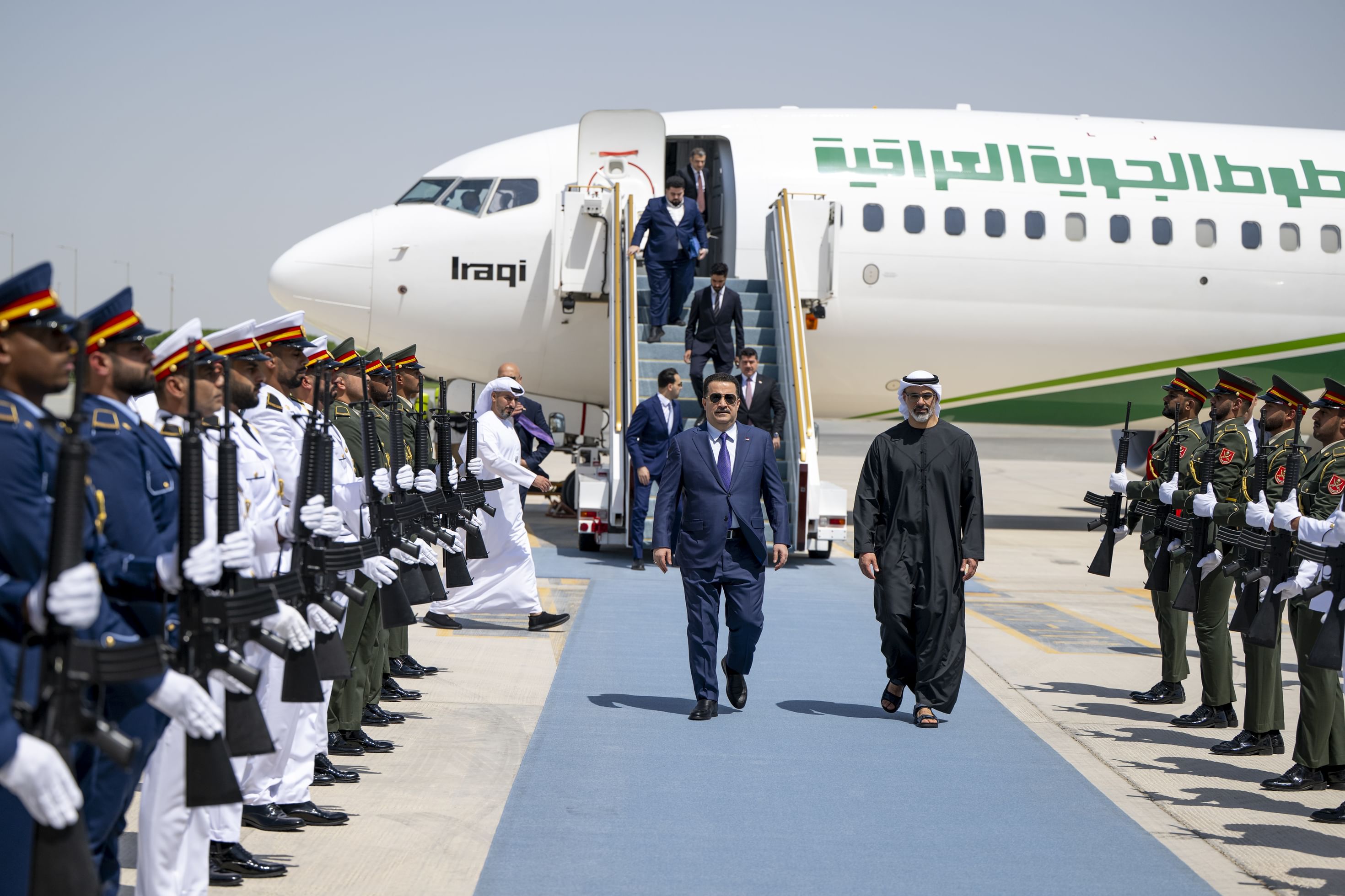 Upon his arrival at Abu Dhabi’s Presidential Flight earlier in the day, His Excellency Mohammed Shia' Al Sudani was welcomed by H.H. Sheikh Khaled bin Mohamed bin Zayed Al Nahyan, Crown Prince of Abu Dhabi, along with several ministers and senior officials.