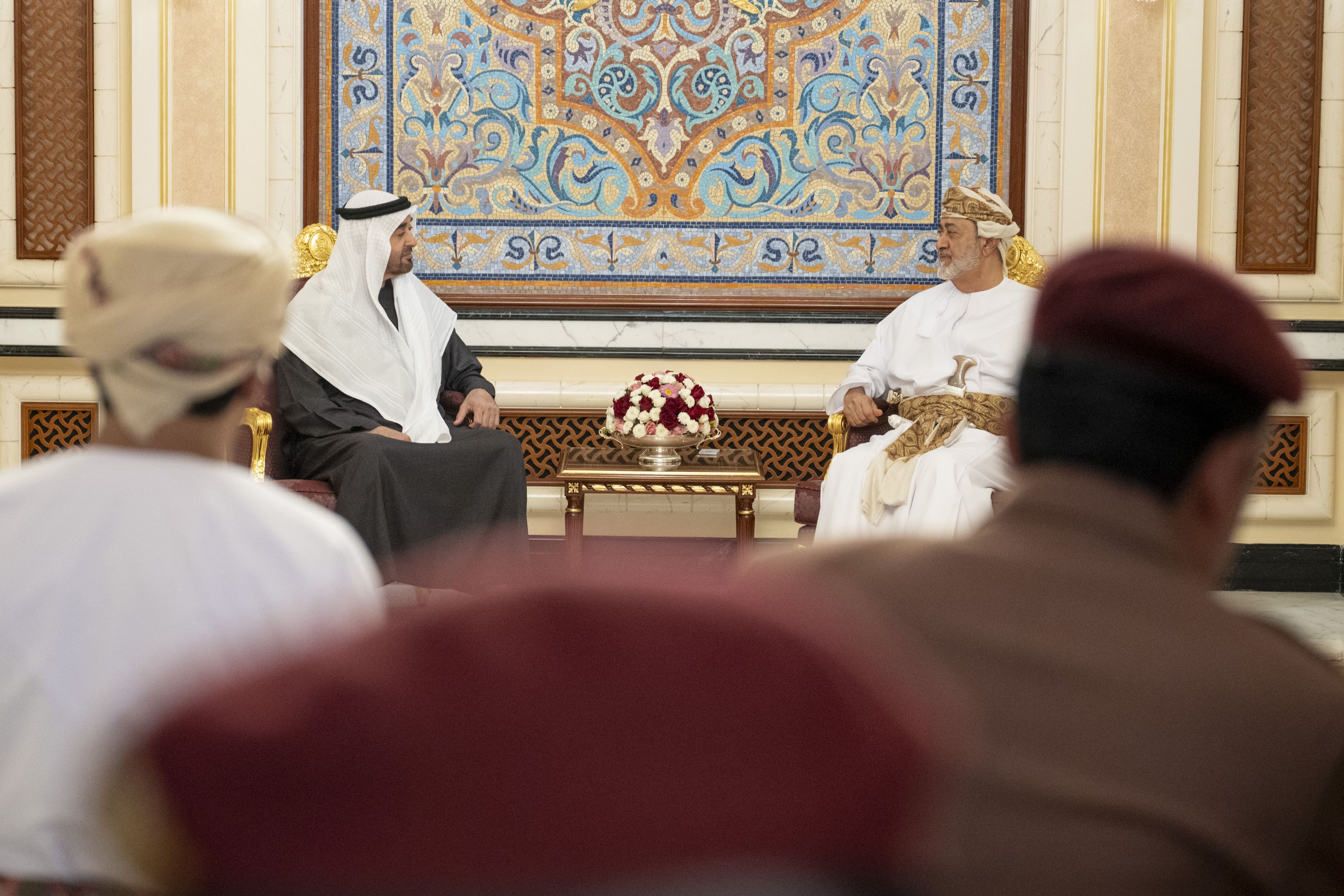 President His Highness Sheikh Mohamed bin Zayed Al Nahyan held talks with His Majesty Sultan Haitham bin Tariq of the Sultanate of Oman to discuss the fraternal ties between the two countries and explore ways to deepen cooperation in a manner that serves shared interests and supports their aspirations for further progress and prosperity.