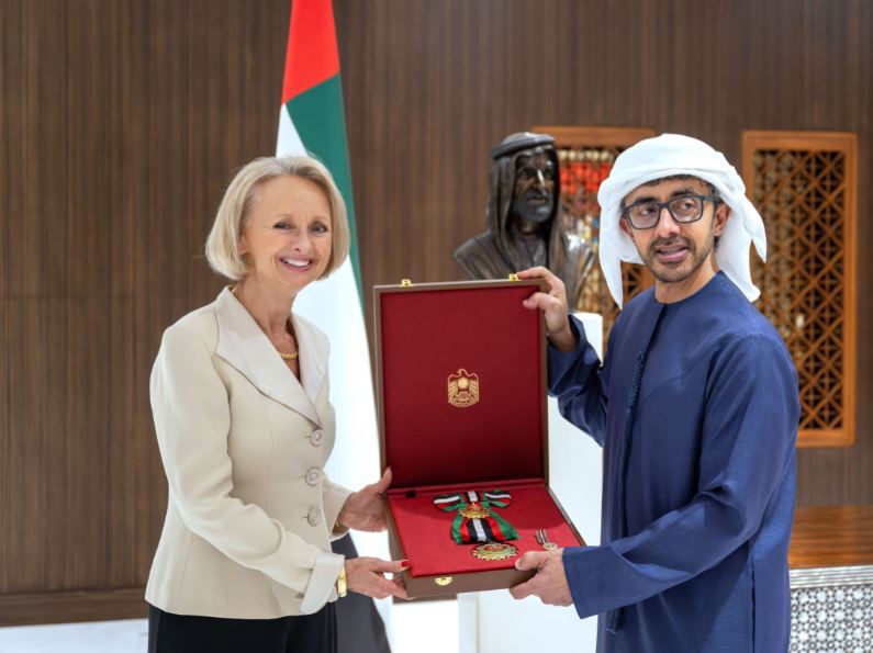 H.H. Sheikh Abdullah bin Zayed Al Nahyan, Deputy Prime Minister and Minister of Foreign Affairs, presented the decoration to the Ambassador during a meeting with her today in Abu Dhabi.