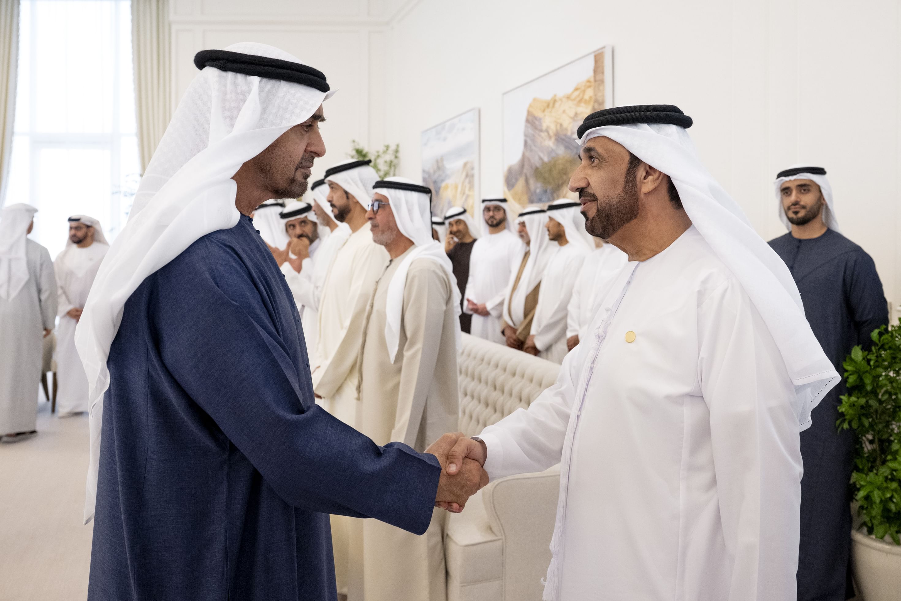 The meeting was attended by H.H. Sheikh Khaled bin Mohamed bin Zayed Al Nahyan, Crown Prince of Abu Dhabi; H.H. Sheikh Hamdan bin Zayed Al Nahyan, Ruler’s Representative in Al Dhafra Region; H.H. Sheikh Saif bin Mohamed Al Nahyan; H.H. Sheikh Surour bin Mohamed Al Nahyan; Lt. General H.H. Sheikh Saif bin Zayed Al Nahyan, Deputy Prime Minister and Minister of the Interior; H.H. Sheikh Hamed bin Zayed Al Nahyan; H.H. Sheikh Khalid bin Zayed Al Nahyan, Chairman of Zayed Higher Organisation for People of Determination; H.H. Sheikh Dr. Sultan bin Khalifa Al Nahyan, Adviser to the UAE President; H.H. Sheikh Theyab bin Mohamed bin Zayed Al Nahyan, Deputy Chairman of the Presidential Court for Development and Fallen Heroes' Affairs; H.H. Sheikh Hamdan bin Mohamed bin Zayed Al Nahyan, Deputy Chairman of the Presidential Court for Special Affairs; H.H. Sheikh Zayed bin Mohamed bin Zayed Al Nahyan; Sheikh Nahyan bin Mubarak Al Nahyan, Minister of Tolerance and Coexistence; and Sheikh Mohammed bin Hamad bin Tahnoun Al Nahyan, Adviser to the UAE President; along with several sheikhs, senior officials, guests and Emirati citizens.