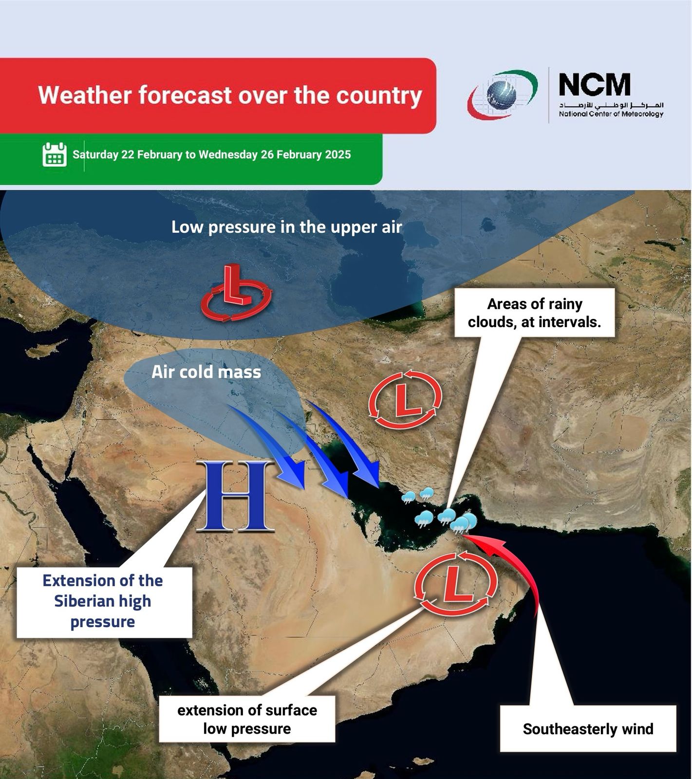 Residents across the UAE should prepare for a dramatic shift in weather conditions next week, as the National Metrology Center (NMC) forecasts a turbulent transition from rising temperatures to chilly winds, dust storms, and even rain between Saturday, February 22, and Wednesday, February 26, 2025.