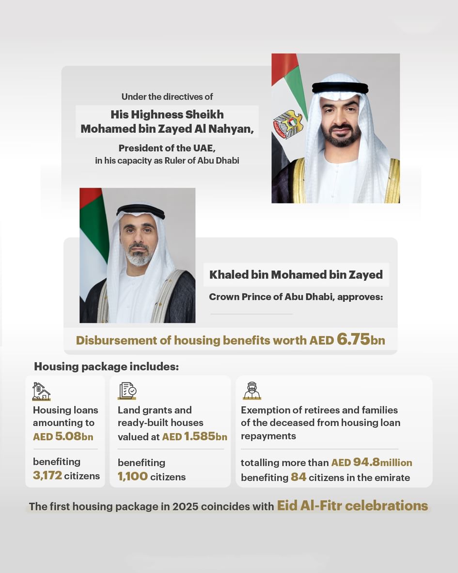 Under directives of UAE President, Crown Prince of Abu Dhabi approves AED6.75 billion housing benefits package for citizens ahead of Eid Al Fitr