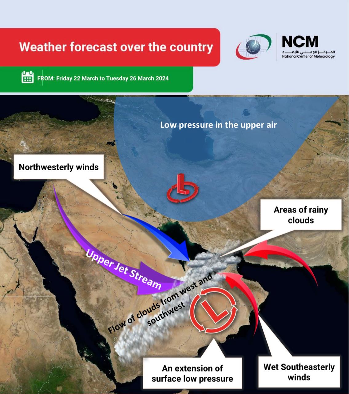 Weather Sitoution over the UAE from Friday 22 March to Tuesday 26 March 2024