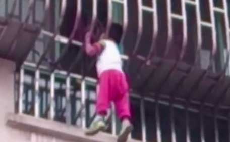 Terrifying mobile phone footage has emerged showing a little boy dangling by his head after falling through the railings of a third-floor apartment in Yixing, Jiangsu province.