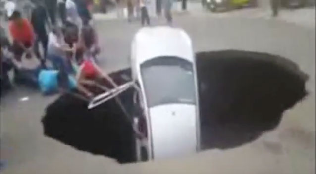 A young family had to be saved after a gigantic sinkhole opened up beneath them and swallowed the car they were sitting in.
