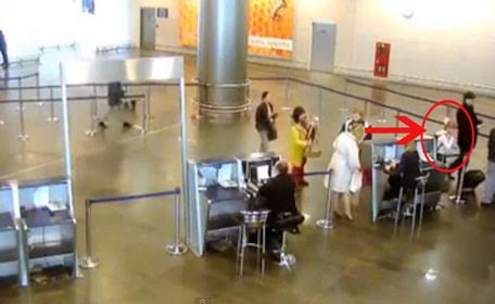 She then joins a line and appears to be meandering around other passengers waiting for the perfect time to slip through one checkpoint seemingly with a number of other people.