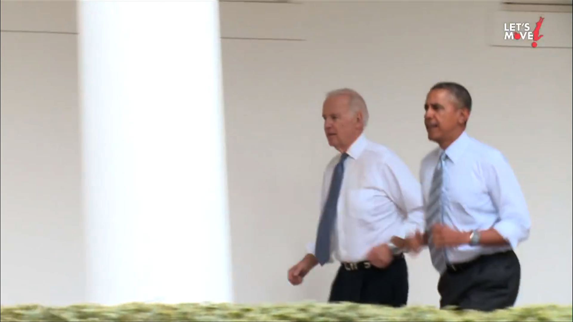 | Barack Obama and Joe Biden have taken part in a video to promote the benefits of exercise. The US President and Vice President are seen jogging around the White House as part of the government's Let's Move campaign. |