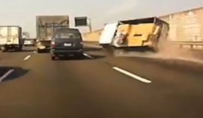 A speeding car driver lose control and slide on the road. The driver is trapped inside as other vehicles pass by.