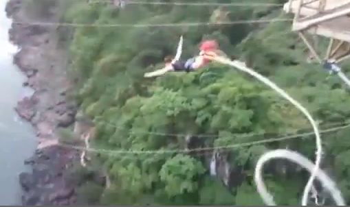Erin Langworthy, 22, was on holiday in Africa on New Year's Eve when she took on the 111-metre (364-foot) bungee jump from the Victoria Falls bridge above the river, which borders Zambia and Zimbabwe.