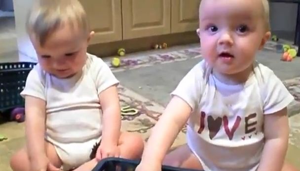 These adorable babies hear a loud noise across the room and take turns trying to imitate it.