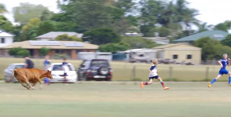 The cow terrorised players during the game in Federation Park in Maryborough, Queensland Australia.
