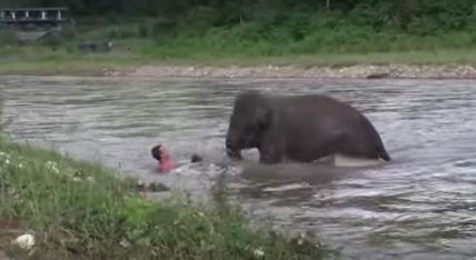 Chaing Mai, Thailand showing an adorable young elephant “rescuing” a man in a river.