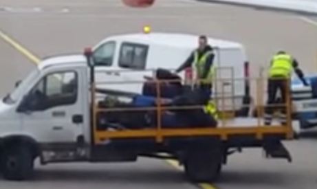 A group of baggage handlers have been filmed dragging the cases off a plane and then lobbing the delicate luggage carelessly into a truck.