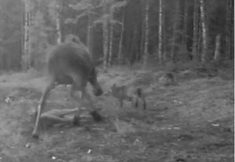 Footage provided to Sweden’s hunters association shows the cow and calf hanging around a salt lick when two wolves decided to disrupt the peaceful scene. It is presumed the calf survived.