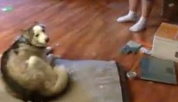 An argument between a husky and a man ensues after the dog steals potato skins.