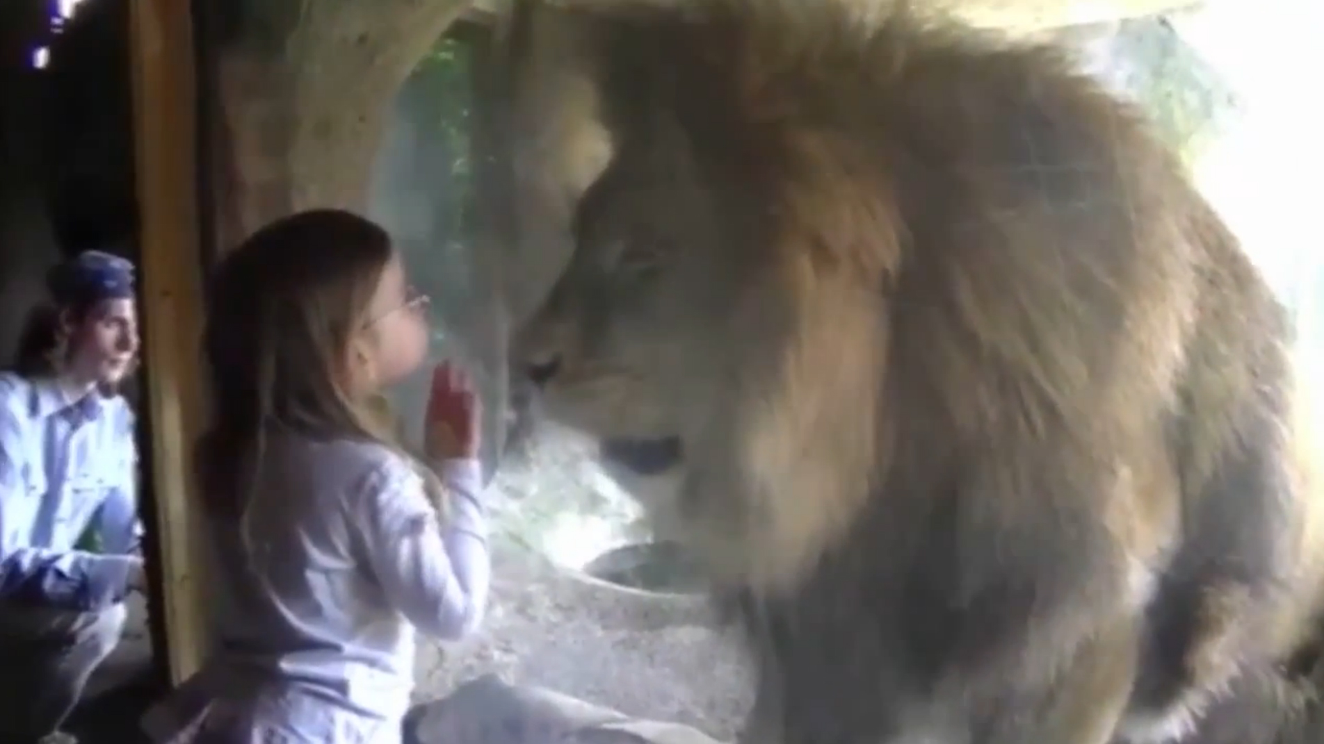 The girl plants an innocent kiss on the glass in front of the lion.