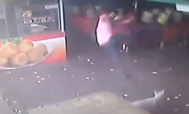 But then the man swings his leg back as far as he can, taking a swing at the defenceless dog.