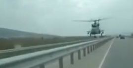 A helicopter has been filmed flying just above the highway as cars past near Gudermes in Russia's Chechen Republic.