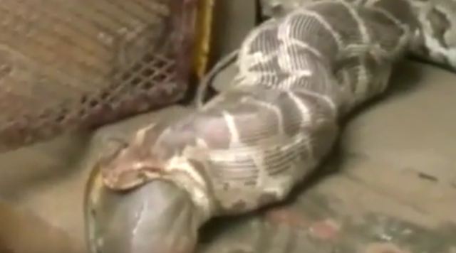 The giant snake, estimated to be up to 12 feet long, steadily stretched its mouth to devour its much larger prey in the village of Gorakhpur, in Northern India.