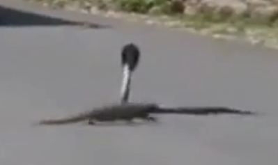 Mongoose hunts cobra on the road