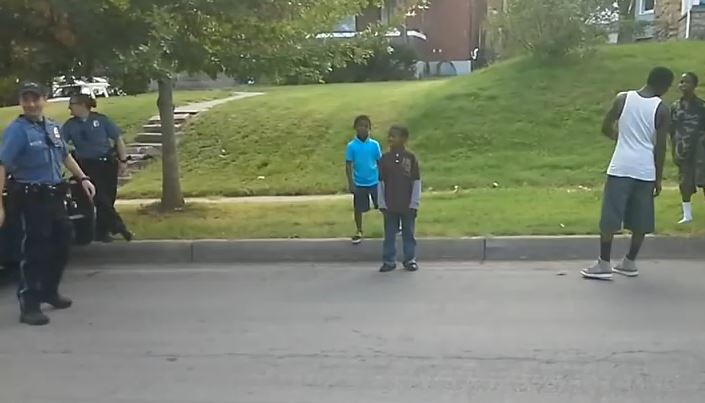 A KCPD officer displaying his "best" moves in a dance-off with neighborhood children in the East Patrol Division.