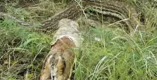 A four metre python who swallowed an entire antelope, decided to abandon its dinner on a farm when it felt threatened by a farmer in South Africa.