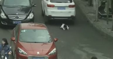 The terrifying moment a toddler in China darted out onto a road before being run over by two cars has been captured on surveillance footage.