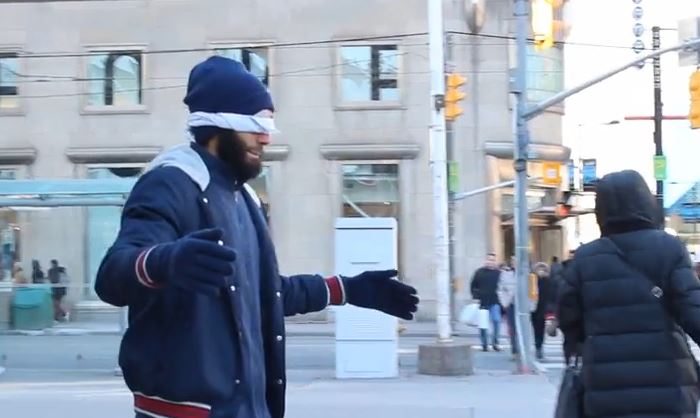 As part of a social experiment to spread awareness, a man in blindfolds stood on the streets of Toronto, Canada, with two placards by his feet, reported TNP.