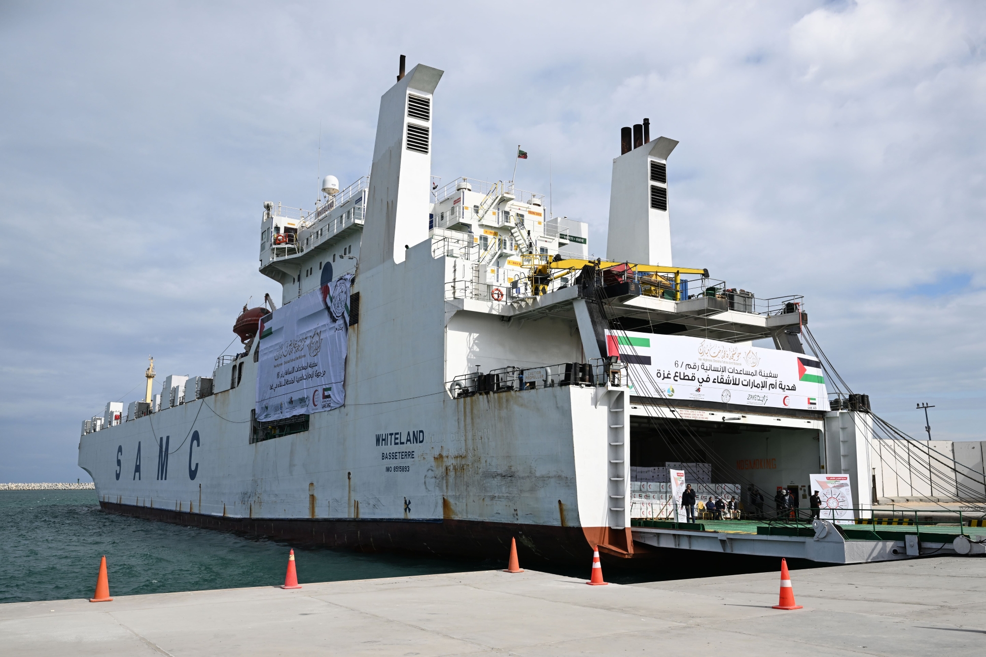 The ship was received at Al Arish Port by a delegation including Dr. Maitha bint Salem Al Shamsi, Minister of State; Rashid Mubarak Al Mansouri, Secretary-General of the Emirates Red Crescent (ERC); and Major General Dr. Khaled Megawer, Governor of North Sinai.