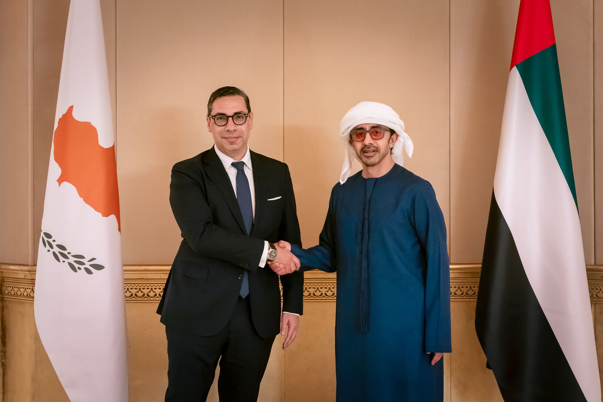 H.H. Sheikh Abdullah bin Zayed Al Nahyan, Deputy Prime Minister and Minister of Foreign Affairs, today received Dr. Constantinos Kombos, Minister of Foreign Affairs of the Republic of Cyprus, in Abu Dhabi.