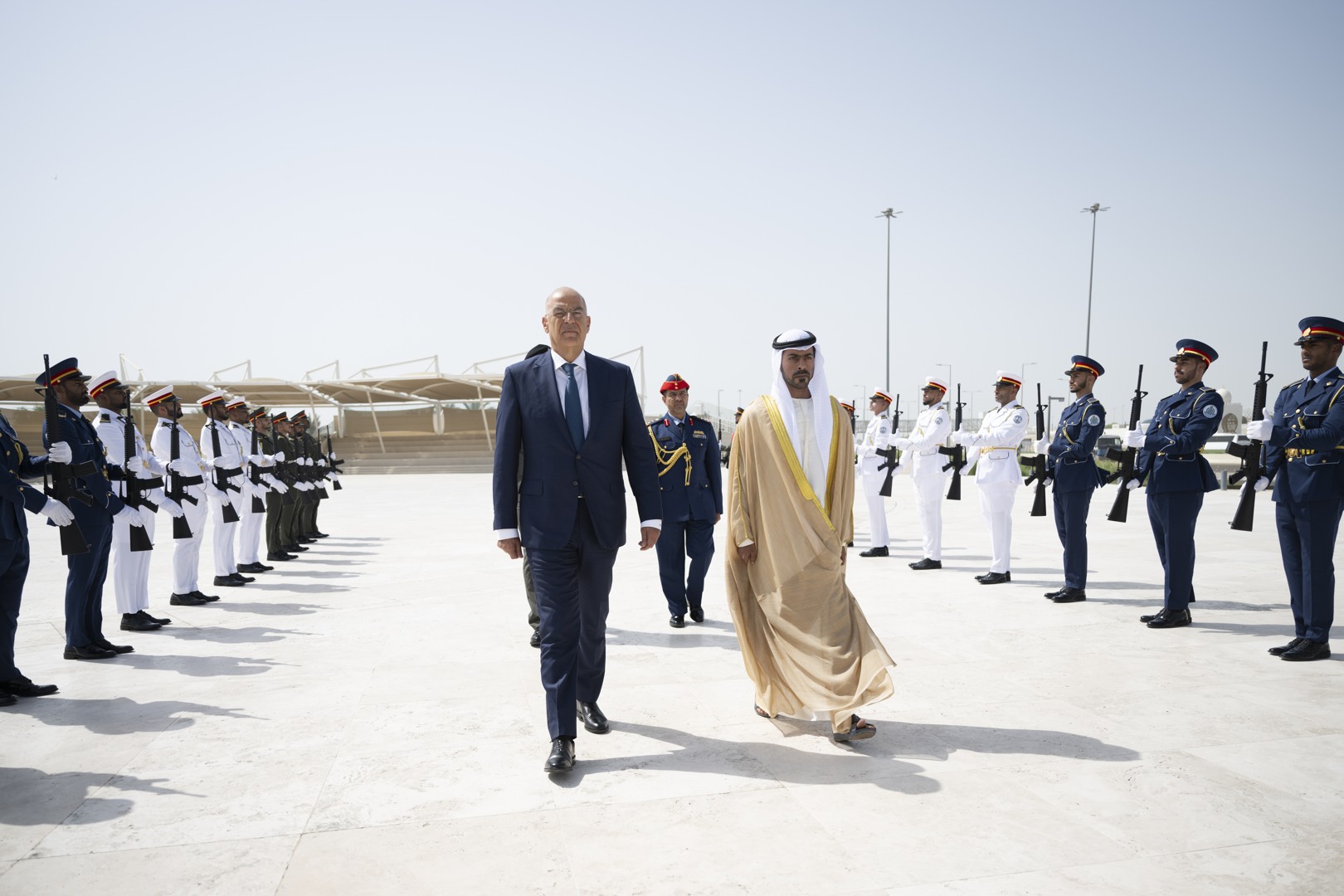 Upon his arrival, Dendias, accompanied by Sheikh Khalifa bin Tahnoun, attended the Guard of Honour ceremony, then laid a wreath at Martyrs' Monument, which is made up of 31 panels leaning on one another as a symbol of solidarity between the leadership, people and soldiers of the UAE.