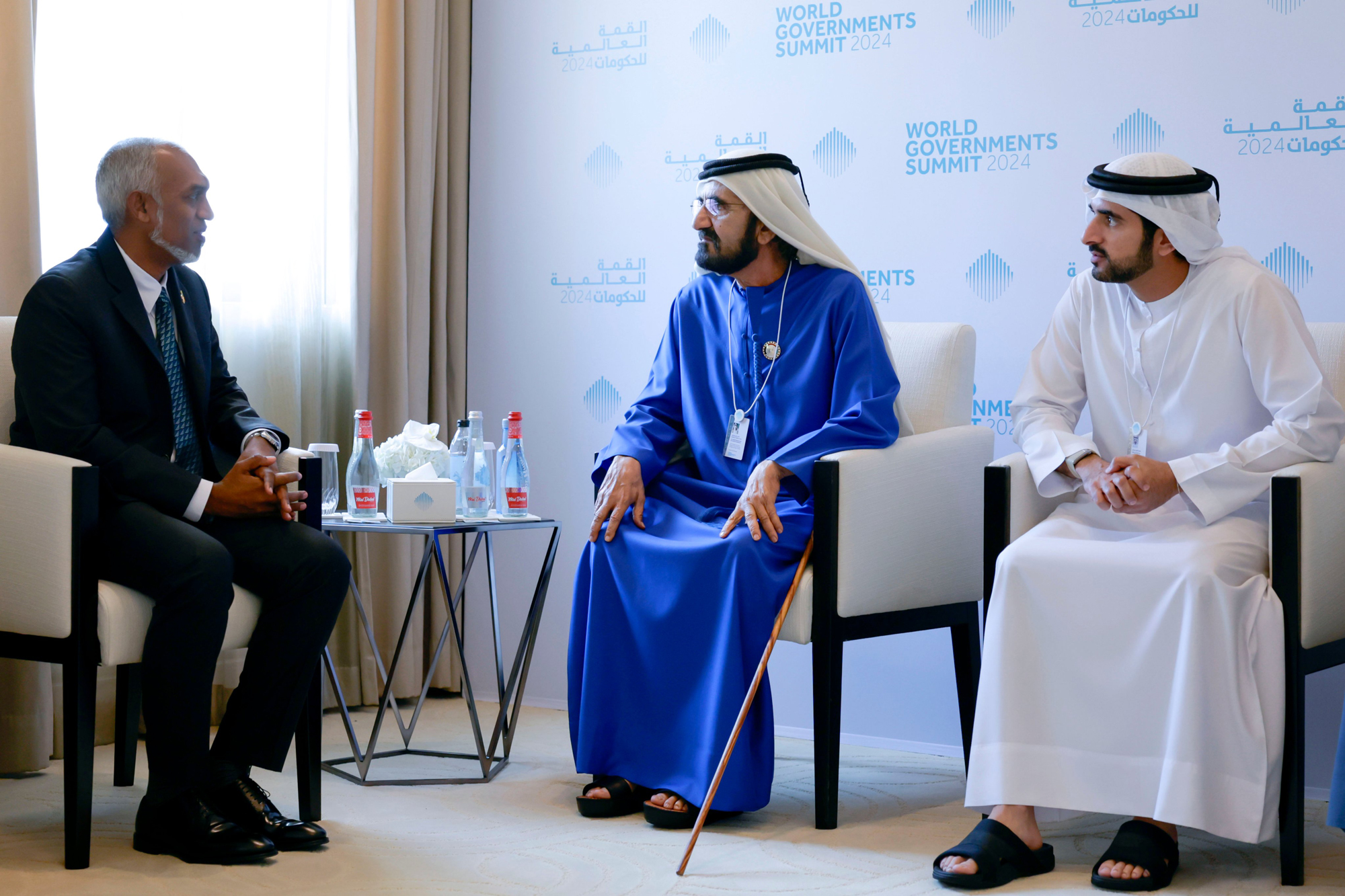 His Highness Sheikh Mohammed bin Rashid Al Maktoum, Vice President and Prime Minister of the UAE and Ruler of Dubai, met with His Excellency Dr. Mohamed Muizzu, President of Maldives, on the second day of the World Governments Summit (WGS) 2024. The meeting was held in the presence of His Highness Sheikh Hamdan bin Mohammed bin Rashid Al Maktoum, Crown Prince of Dubai and Chairman of The Executive Council of Dubai.