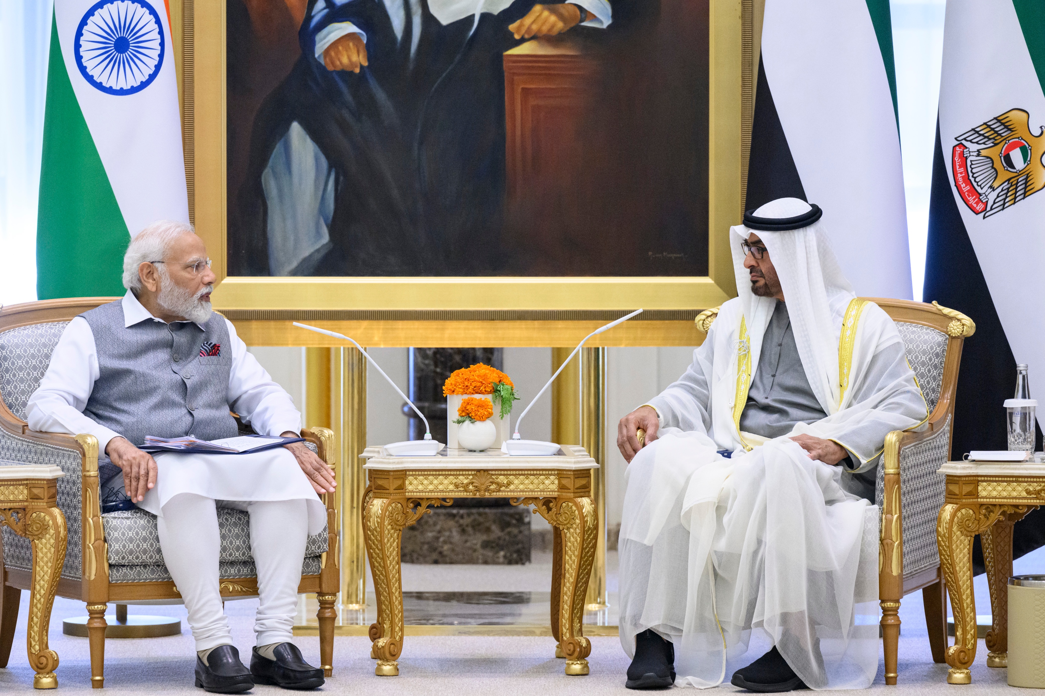 During their meeting at Qasr Al Watan in Abu Dhabi, His Highness welcomed the visit of Prime Minister Modi as an opportunity to further strengthen bilateral ties for the benefit of both nations and their people – across economic, investment, development and renewable energy fields, as well as health, food security, education, and advanced technology.