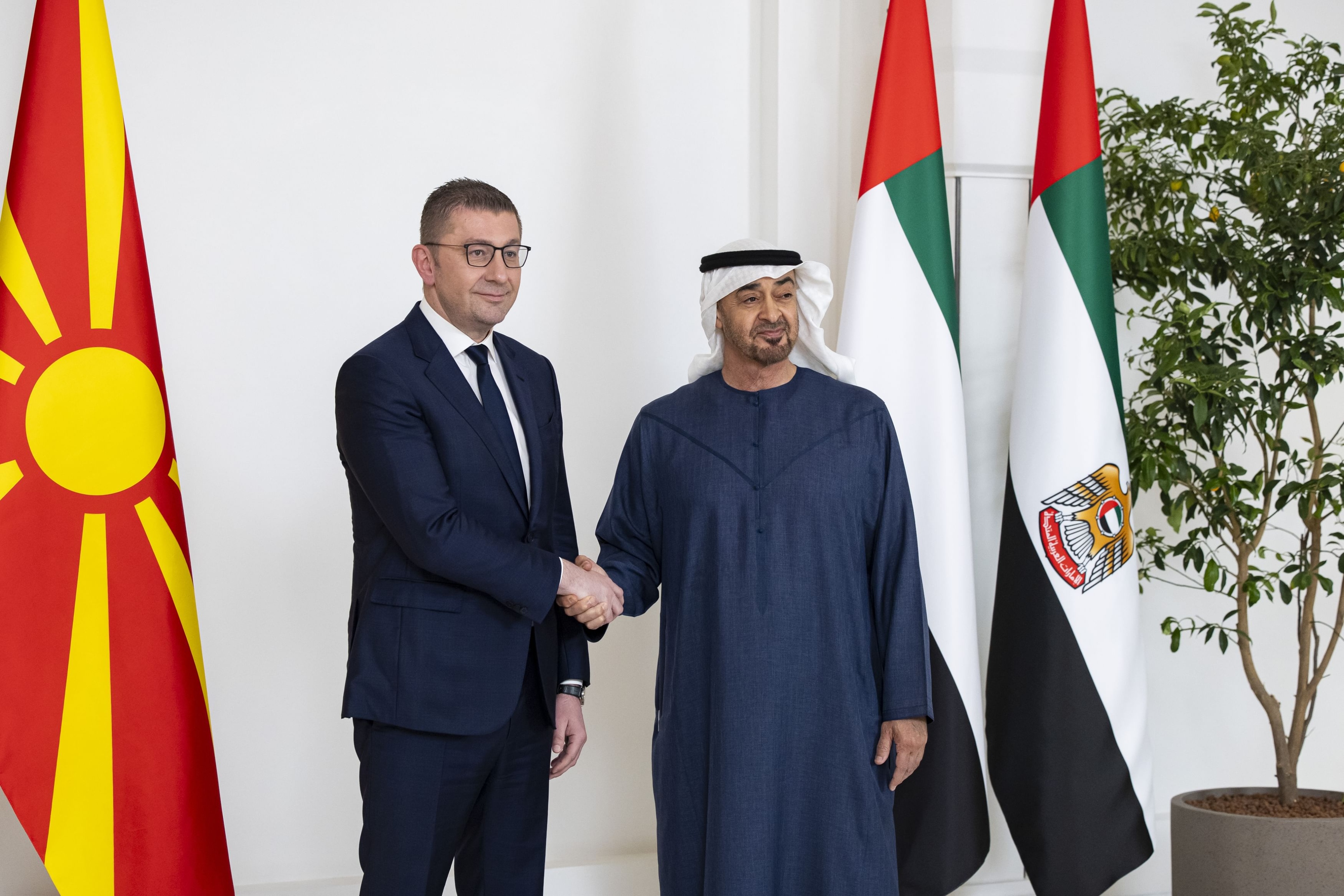 During the meeting, His Highness Sheikh Mohamed bin Zayed Al Nahyan and His Excellency Dr Hristijan Mickoski witnessed the announcement of two memoranda of understanding — the first concerning economic cooperation between the two countries, and the second between the Anwar Gargash Diplomatic Academy and the Ministry of Foreign Affairs of North Macedonia.