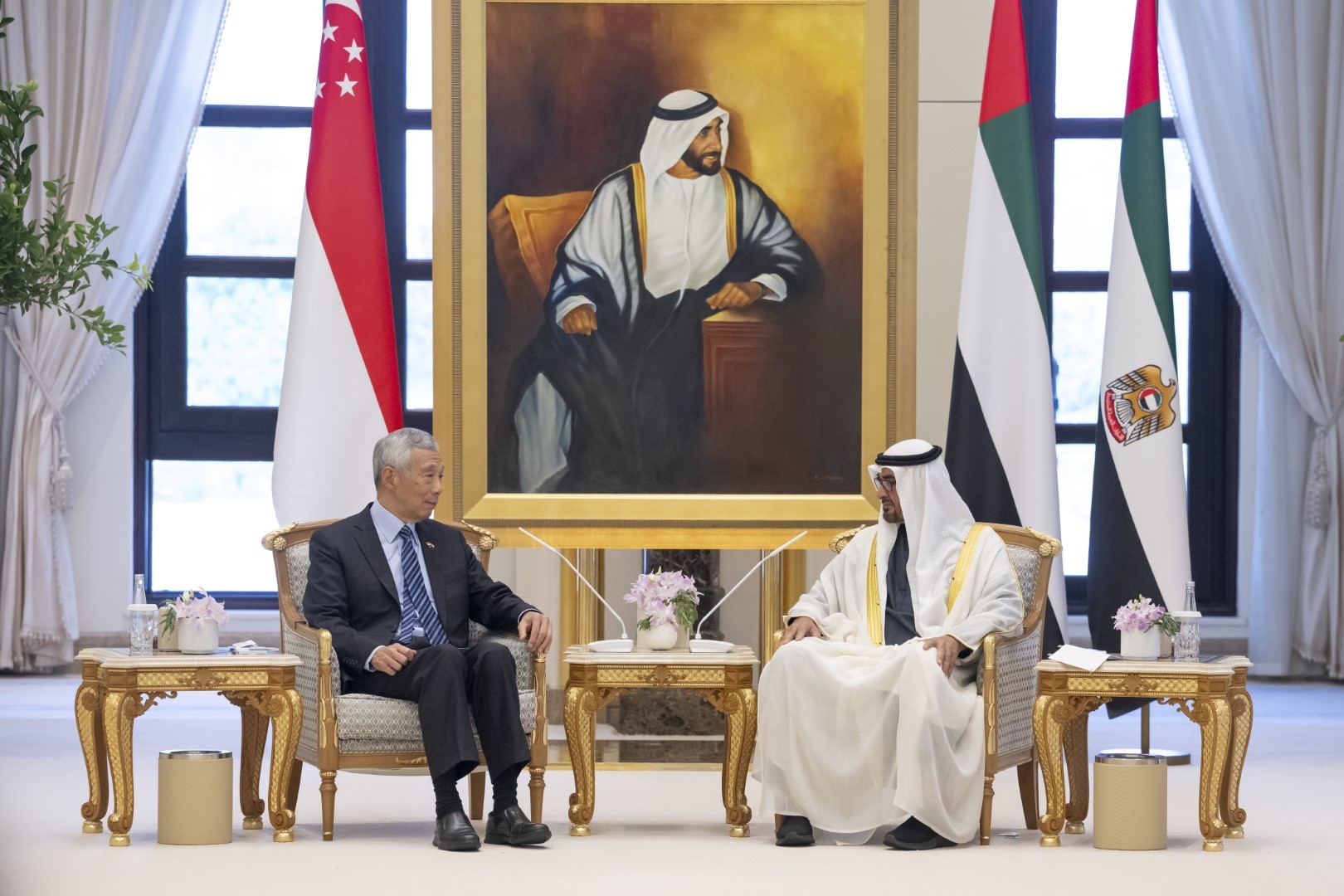 The meeting and luncheon were attended by H.H. Sheikh Khaled bin Mohamed bin Zayed Al Nahyan, Crown Prince of Abu Dhabi; H.H. Sheikh Theyab bin Mohamed bin Zayed Al Nahyan, Chairman of the Office of Development and Martyrs Families Affairs at the Presidential Court; Sheikh Mohammed bin Hamad bin Tahnoun Al Nahyan, Advisor for Special Affairs at the Presidential Court; Mohamed bin Hadi Al Hussaini, Minister of State for Financial Affairs; Dr. Sultan bin Ahmed Al Jaber, Minister of Industry and Advanced Technology; Mariam bint Mohammed Almheiri, Minister of Climate Change and the Environment; Dr. Thani bin Ahmed Al Zeyoudi, Minister of State for Foreign Trade; Ahmed bin Ali Al Sayegh, Minister of State; Khaldoon Khalifa Al Mubarak, Chairman of the Executive Affairs Authority; Jamal Al Suwaidi, UAE Ambassador to the Republic of Singapore, and a number of senior state officials.